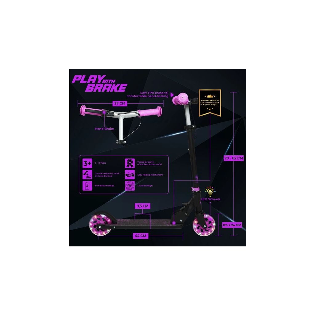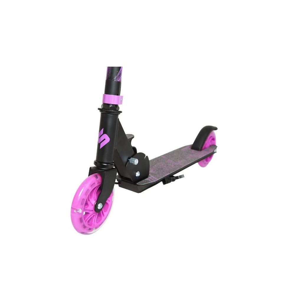 Dětská koloběžka Story Play s ruční brzdou, led kolečka, fialová