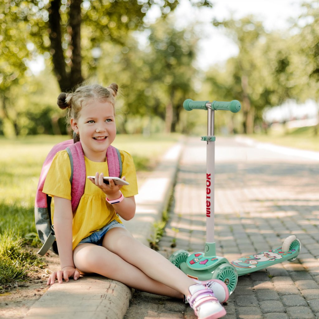 - Bezpečná jízda – tříkolová konstrukce s širokým rozvorem předních kol usnadňuje udržení rovnováhy a naučení se jízdě. Nožní brzda na zadním kole umožňuje dítěti rychle a účinně zastavit koloběžku a svítící kola zlepšují viditelnost na silnici, čímž maximalizují úroveň bezpečnosti.