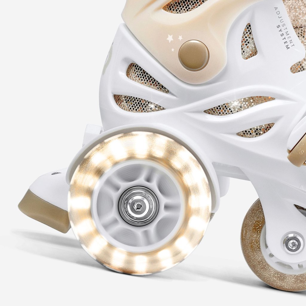 Kola jsou vyrobena z vysoce kvalitních materiálů. Jejich velikost, rozestupy a uspořádání usnadňují první, nejisté kroky. Za hladký chod kol jsou zodpovědná ložiska třídy ABEC-7. Další výhodou koleček je jejich vzhled - třpytí se jako posypaná třpytkami a dvě větší při jízdě svítí. Zamiluje si je jistě každá malá princezna!