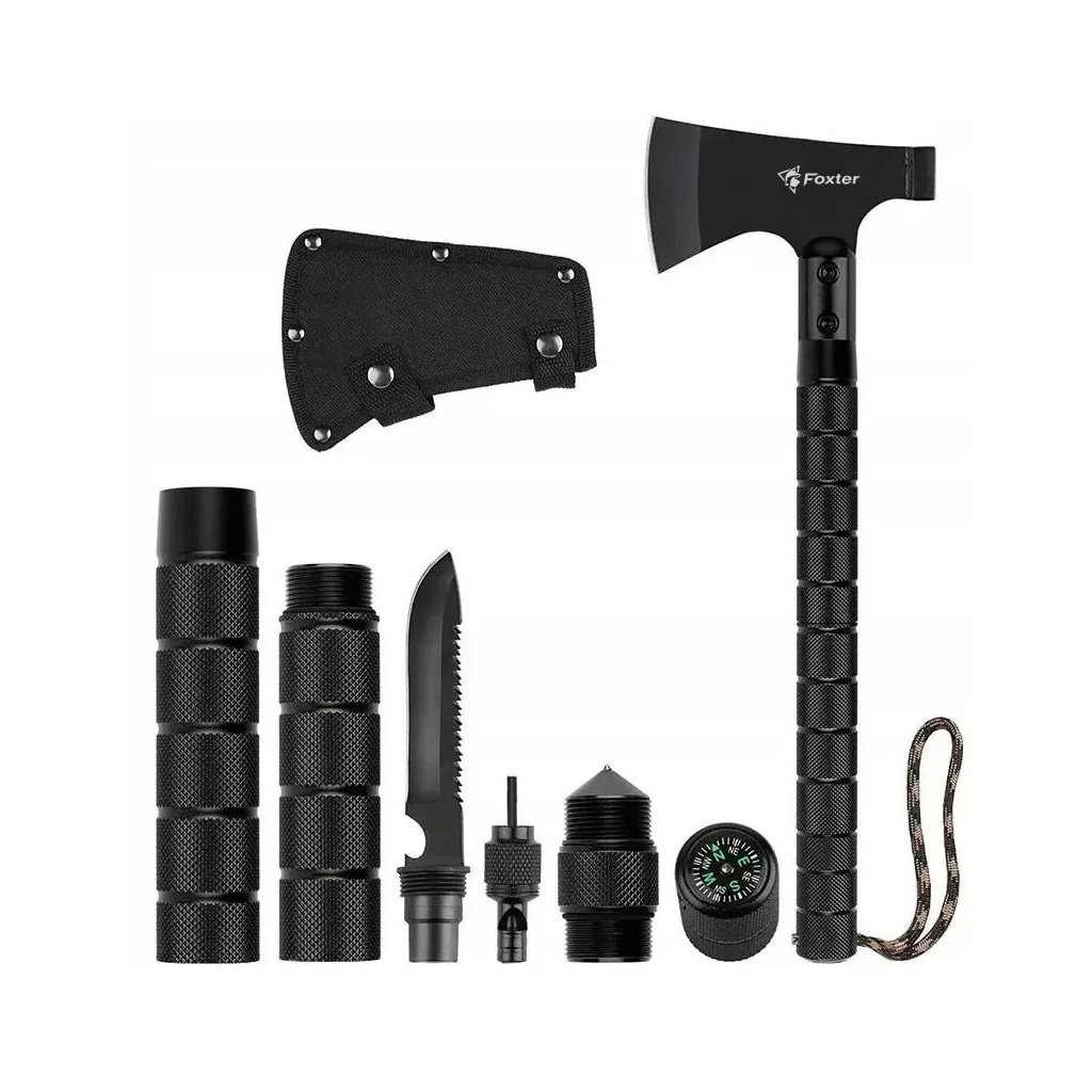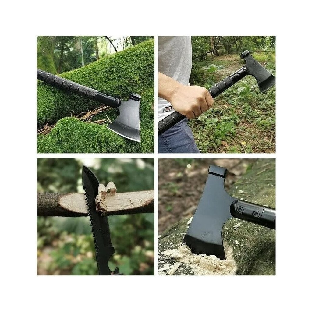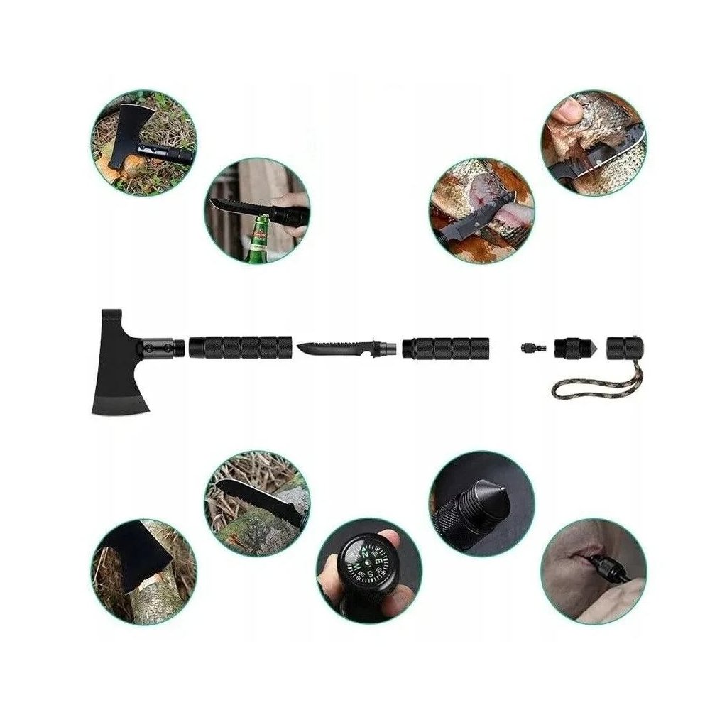 Tato velmi praktická, skládací multifunkční sekera je vyrobena z velmi kvalitní oceli. Sekera v sobě má multifunkční taktický nůž, píšťalku s křesadlem, kladívko, kompas, a provázek.