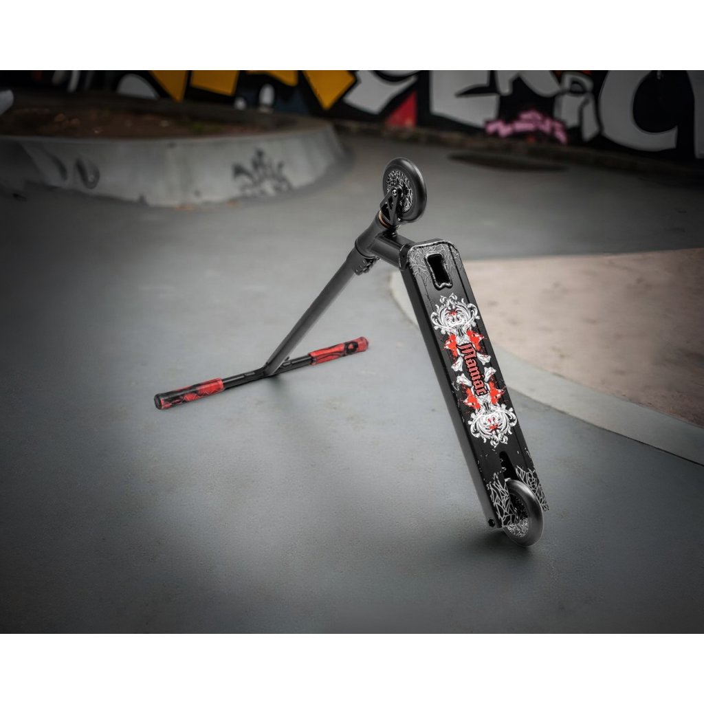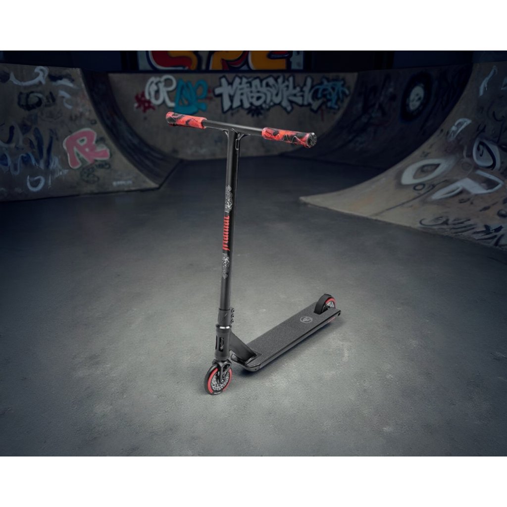 - Speciálně navržený tvar plošiny a optimální rovnováha mezi hmotností a pevností dělají z koloběžky Maniac skvělou volbu pro triky