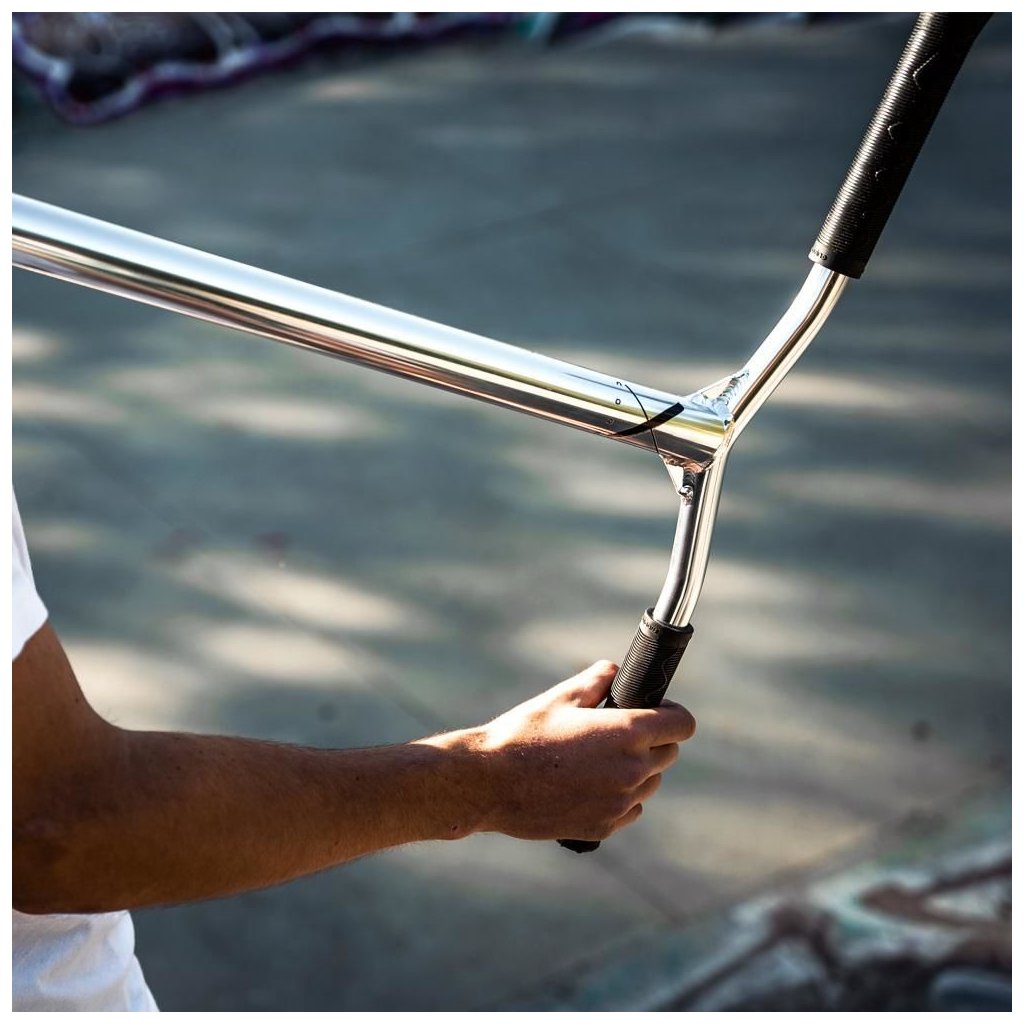 Koloběžka má odlehčenou oversize zesílenou tyč 35 mm z leteckého hliníku moderní konstrukce s vevařenou vrchní vzpěrou.