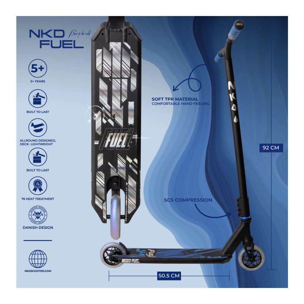 Kolečkový skútr NKD FUEL je vyroben tak, aby splňoval požadavky všech nadšenců, kteří chtějí zkoušet nové triky v parku nebo se stylově a snadno pohybovat po městských ulicích. Díky svému všestrannému přístupu patří mezi nejlehčí a nejpevnější koloběžky, které dnes můžete na trhu najít.