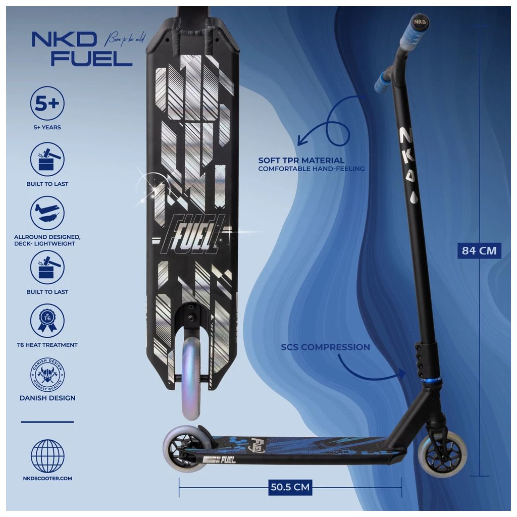 NKD FUEL je vyroben tak, aby splňoval požadavky všech nadšenců, kteří chtějí zkoušet nové triky v parku nebo se stylově a snadno pohybovat po městských ulicích. Díky svému všestrannému přístupu patří mezi nejlehčí a nejpevnější koloběžky, které dnes můžete na trhu najít.