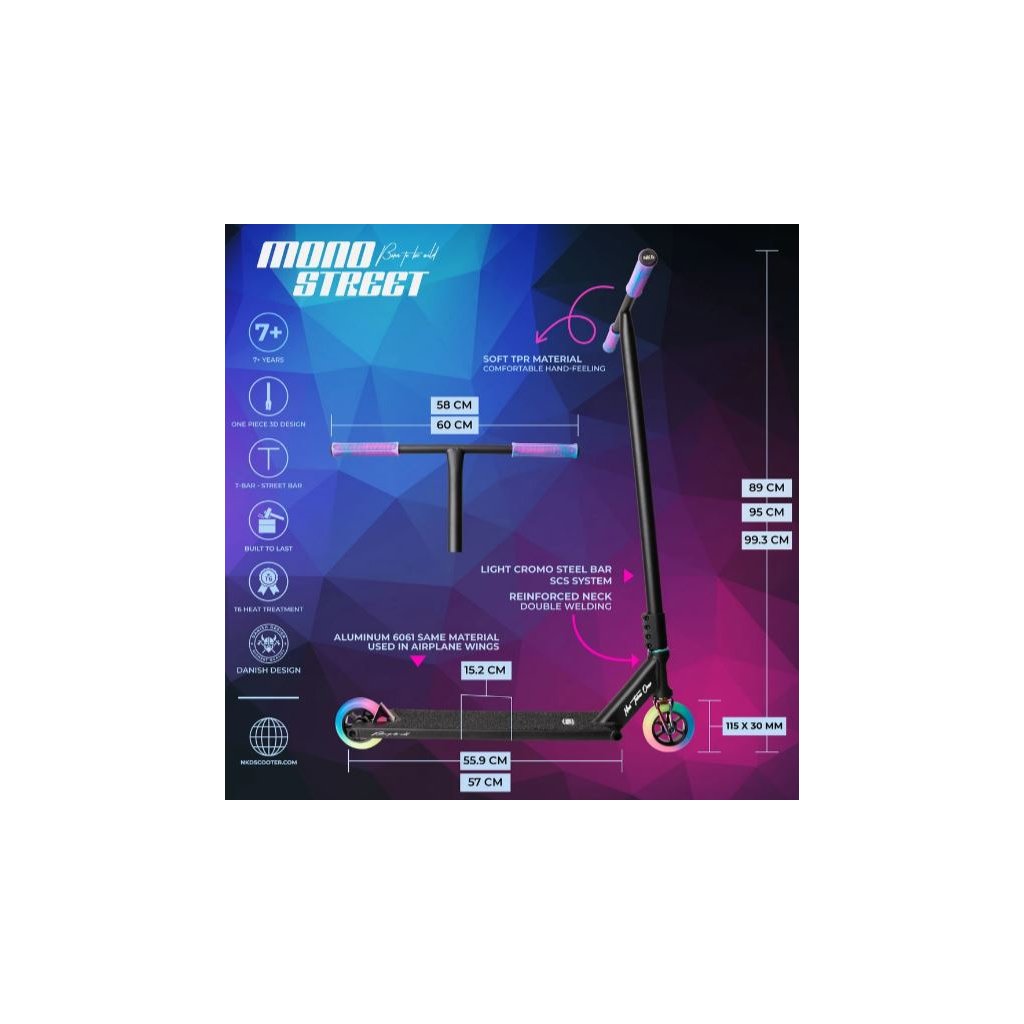 NKD MONO je působivá pouliční freestyle koloběžka, která konkuruje některým z nejuznávanějších značek, jako je Tilit, a nabízí silné vlastnosti pro ty, kteří si cení kvality a výkonu.