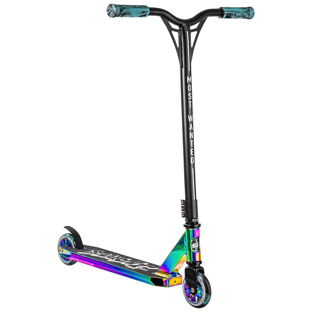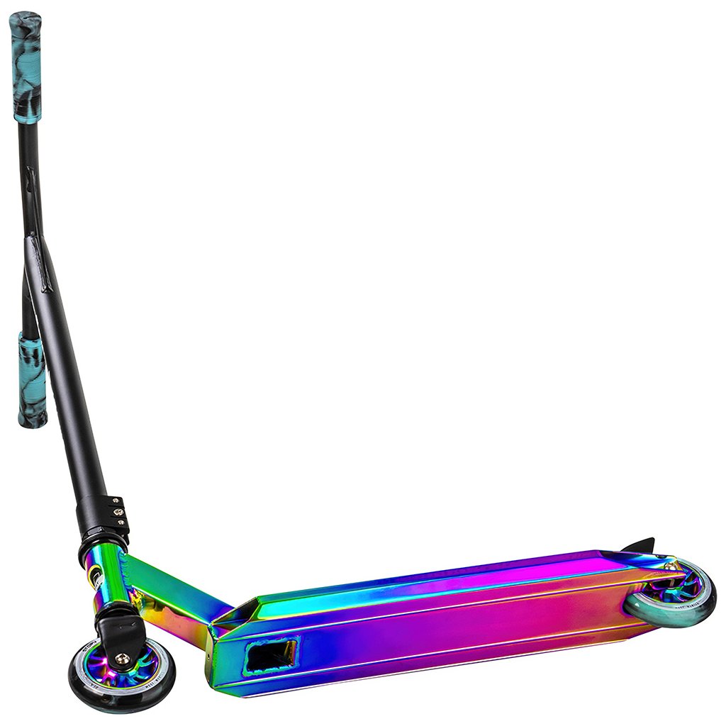 Tato freestyle koloběžka je vybavena "Rogue of the deck" = deska je vyrobena ze silného hliníku a nabízí nejen výřez pro viditelnost vidlice skrz hlavovou tyč, ale také dvě kluzné lišty na spodní straně desky.