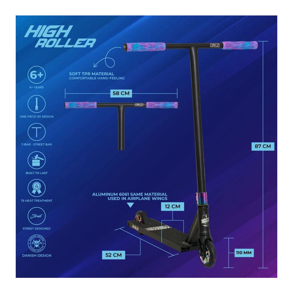 Zažijte adrenalin z ovládnutí umění triků s freestyle koloběžkou STORY HIGH ROLLER přizpůsobenou pro mírně pokročilé i pro zkušenější jezdce.