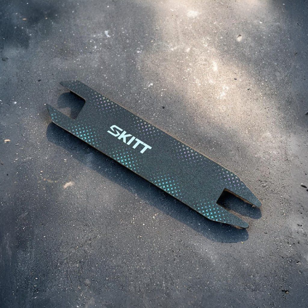 Náhradní protiskluzový griptape je na míru střižený pro Skitt freestyle koloběžku Scout. Nabízí bezpečný a protiskluzový povrch. Díky odolné zrnitosti poskytuje spolehlivou trakci pro hladké ovládání při kaskadérských kouscích i každodení jízdě.