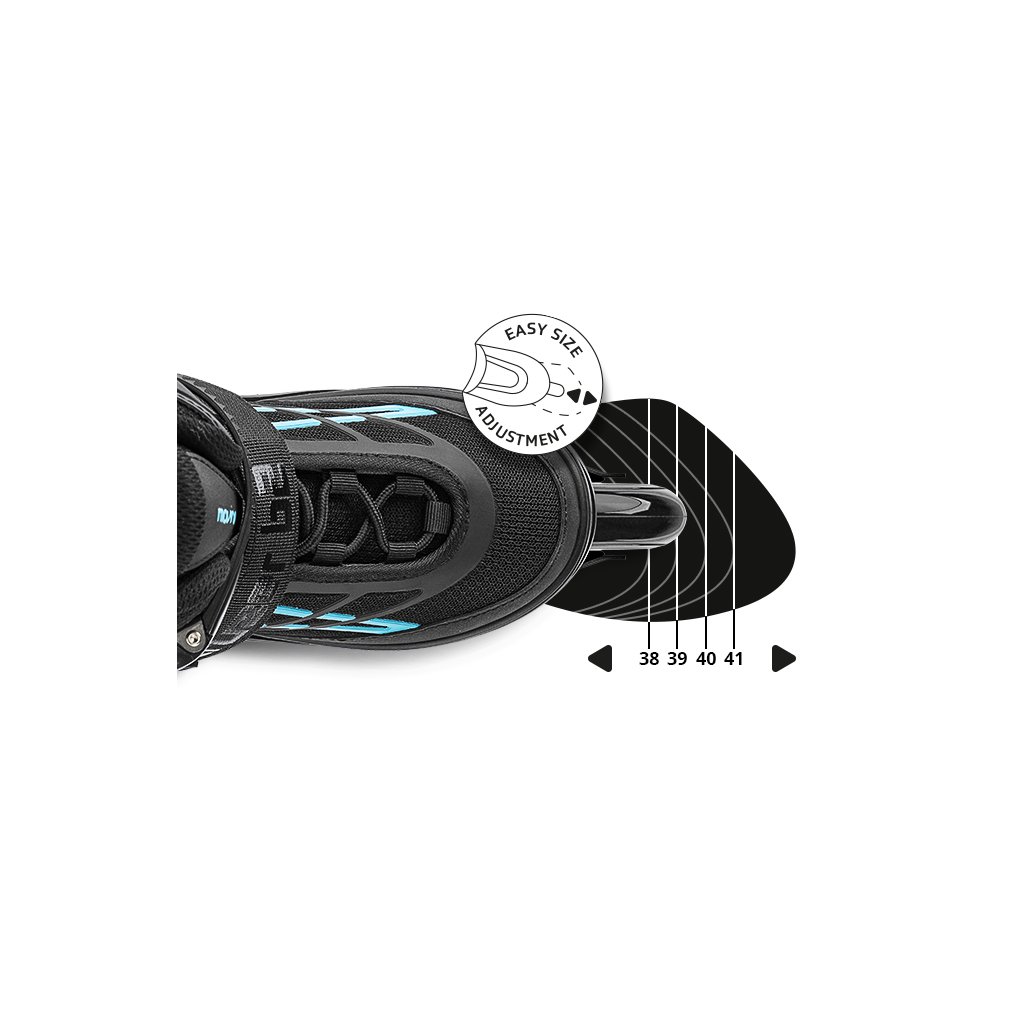 POHODLNÝ SYSTÉM NASTAVENÍ VELIKOSTI. Movino Cruzer B2 má 4-stupňové nastavení velikosti v rozmezí 34-37 (délka stélky 22-24 cm) a 38-41 (délka stélky 24-26 cm). Systém nastavení je rychlý a spolehlivý.