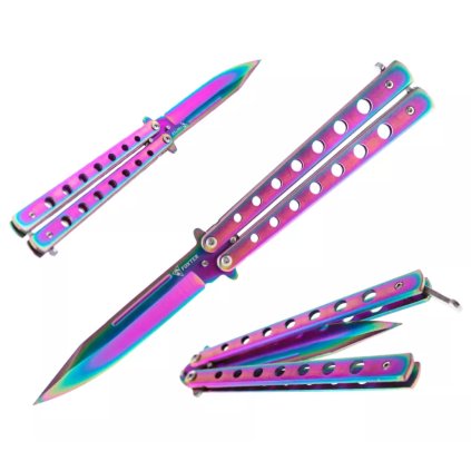 Motýlí nůž duhový motýlí nůž duhový sharp fade 22,5 cm. Pečlivě vyrobený motýlí nůž používaný především k provádění různých triků a akrobacie.