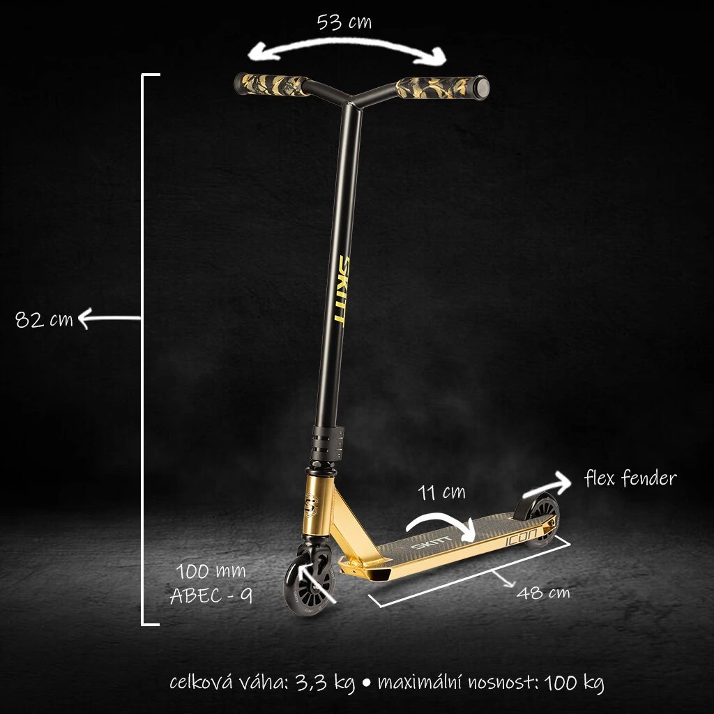 Hledáš koloběžku, která tě nenechá ve štychu při prvních skocích, ale nestojí majlant? SKITT ICON Gold je tvá čistá jízdenka do skateparku. S tímto elegantním a minimalistickým strojem plným zlatých detailů nejenže oslníš kámoše, ale hlavně získáš jistotu při učení nových triků. Je neuvěřitelně lehká, perfektně vyvážená a připravená to s tebou zvládnout od prvního bunny hopu až po vytoužené barspiny.