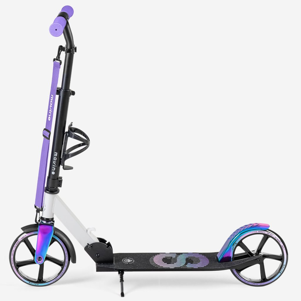 Movino Infinity je pohodlná městská koloběžka pro děti a mládež, která je oblíbená především na cesty do školy. Má nízko zavěšenou desku, kterou ocení mladší uživatelé. Model Infinity byl vybaven praktickým příslušenstvím: přepravním popruhem a držákem na láhev.