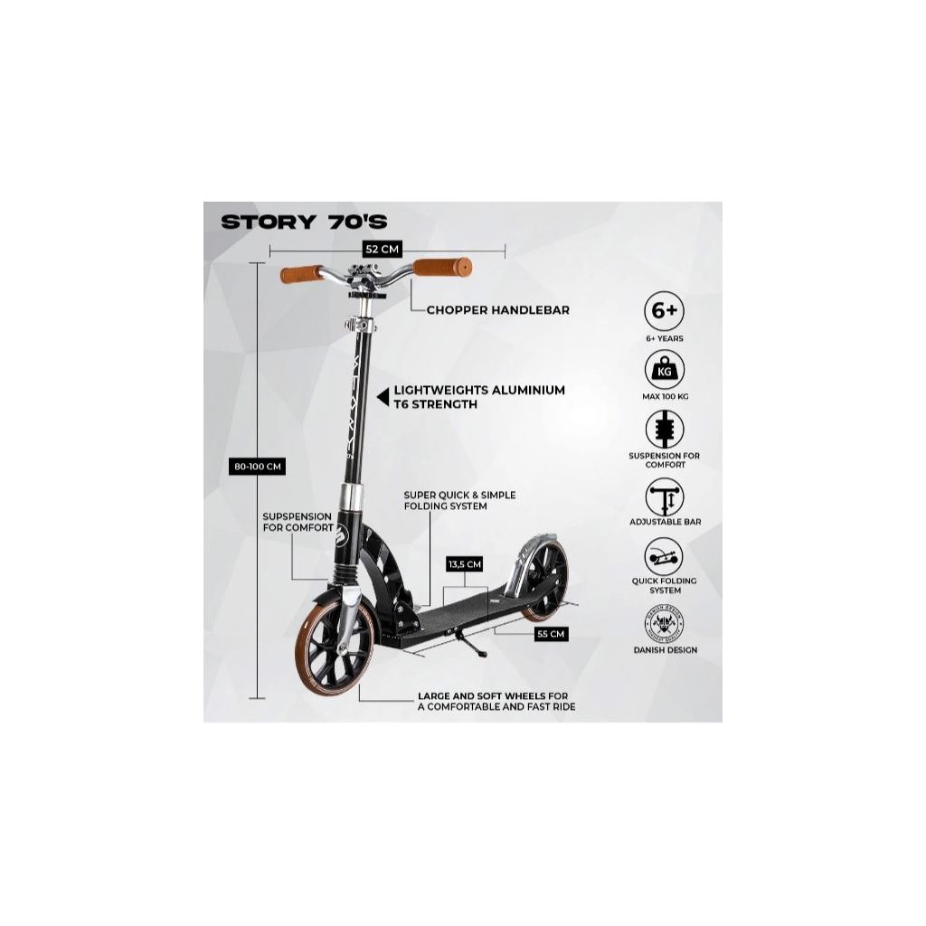 Koloběžka Story 70's je určena k přepravě a lze ji výškově nastavit tak, aby vyhovovala dospělým i dětem. Kromě toho má skládací systém, díky kterému koloběžka zabírá méně místa, když cestujete autobusem nebo vlakem. Transportní koloběžky jsou skvělé pro dojíždějící, kteří se chtějí rychle pohybovat.