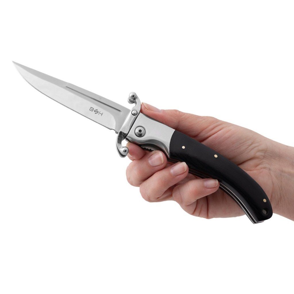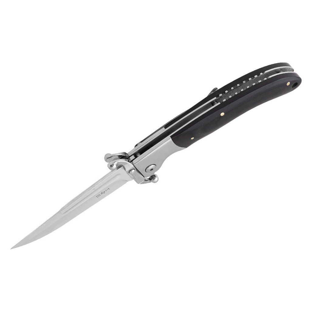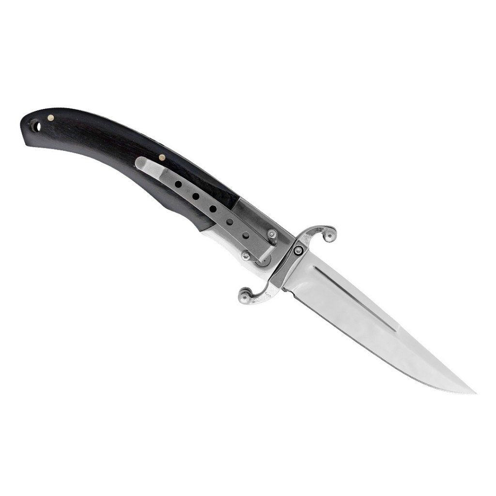 Rukojeť je tvarovaná a povrchově upravená hladkými černými dřevěnými šupinami, což zajišťuje bezpečný úchop a pohodlné používání.